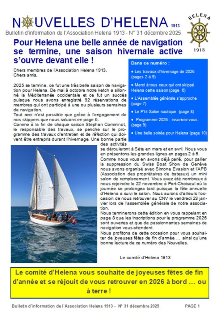 L’assemblée générale de l’Association Helena 1913 aura lieu le 23 janvier 2026 à Port-Choiseul, au Club Nautique de Versoix.